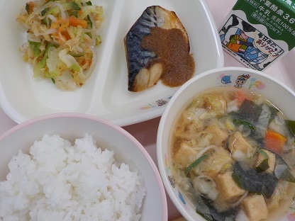 ごはん 鯖のごまだれ たくあん和え 生揚げの味噌汁 牛乳