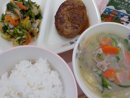 ごはん おろしハンバーグ 梅おかか和え 体ぽかぽか根菜汁 牛乳
