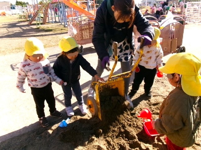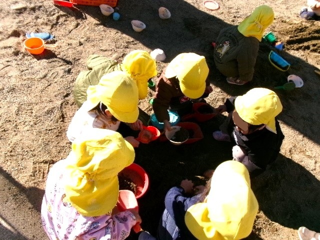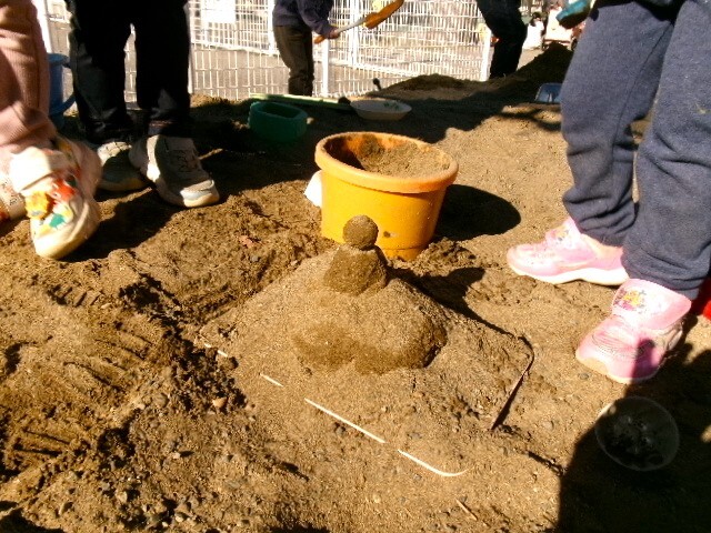 イチョウの木の砂場に砂を入れると、
