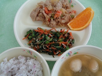 ゆかりご飯みそ汁(豆腐、わかめ、麩、椎茸)肉じゃが小松菜の磯香あえオレンジ