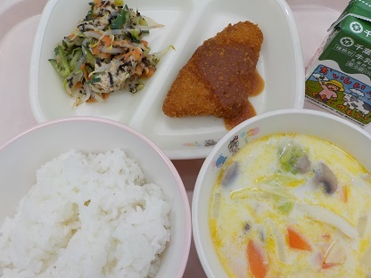 ごはん ぶり味噌カツ のりサラダ 白菜のクリーム煮 牛乳