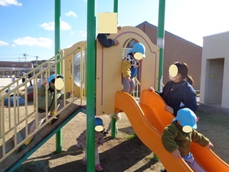 すべり台では、先生の腕を遮断機に見立てて遊んでいます。これは子ども達に大人気です。