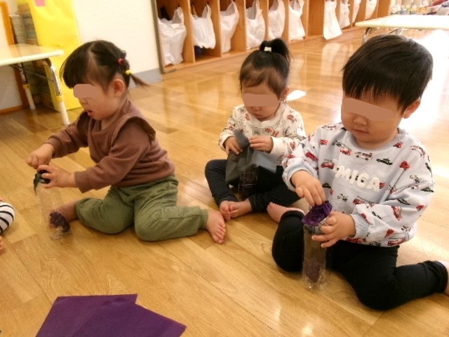 りす組さん、ペットボトルに花紙を