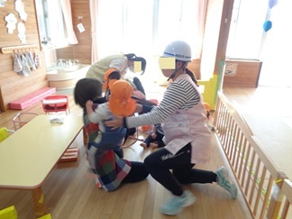 避難訓練です。地震からの出火想定で行いました。子ども達も落ち着いて行動をすることが身についてきました。繰り返し訓練することが大切ですね。