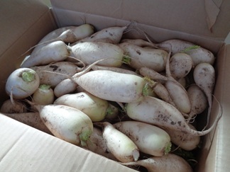 白浜小学校さんよりたくさんの大根をいただきました。おいしそうな大根ですね。早速、給食に出してもらいましょう。