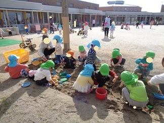 ひよこ組、りす組、うさぎ組のお友達が所狭しと砂場を楽しんでいます。
