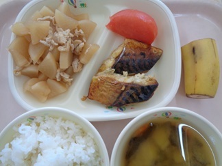 ご飯みそ汁(さつま芋、油揚げ、わかめ、人参)鯖のカレー焼きトマト大根の旨煮※いただいた大根ですバナナ