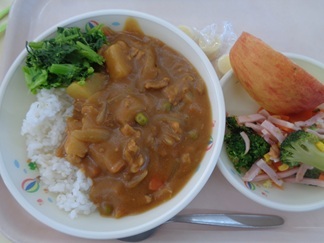 カレーライス※地域の方にいただいた菜花を添えてチーズで鉄分ブロッコリーのサラダりんご