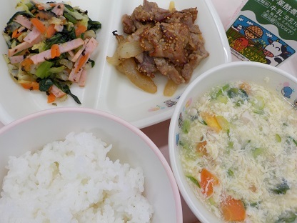 ごはん ごま焼肉 のり酢和え かきたま汁 牛乳
