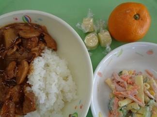 ハヤシライスチーズで鉄分マカロニサラダみかんおやつは、しょうゆせんべいビスコ