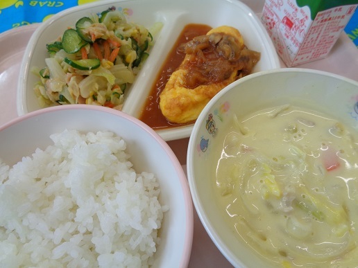 ごはん オムレツきのこソース ツナサラダ 白菜のクリーム煮 牛乳