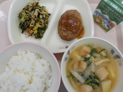 ごはん おろしハンバーグ 磯香和え お麩の味噌汁 牛乳