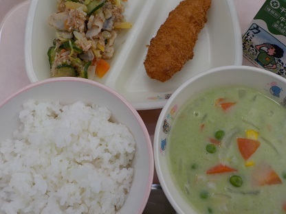 ごはん ささみチーズフライ かみかみサラダ みなたんスープ 牛乳