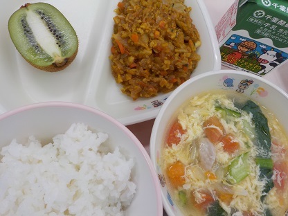 ごはん ドライカレー トマトと卵のスープ キウイ 牛乳