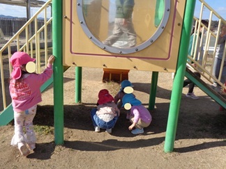 総合遊具では、りす組、うさぎ組、ぱんだ組のお友達が遊んでいます。おままごとが始まりそうですね。
