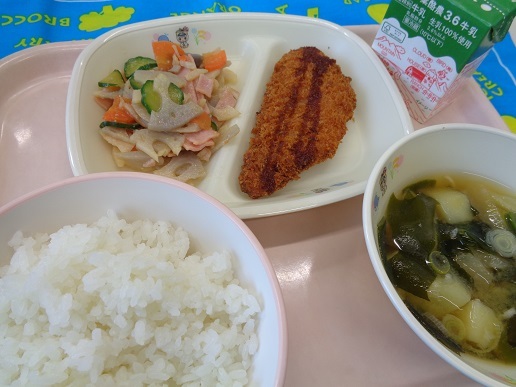 ごはん キンメフライ れんこんサラダ じゃがいもとわかめのみそ汁 牛乳