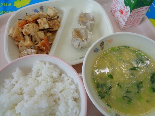 ごはん しゅうまい 麻婆豆腐 中華コーンスープ 牛乳
