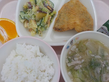 ごはん あじフライ お芋アーモンドサラダ 豚汁 しらぬい 牛乳