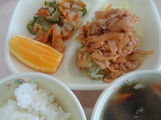 ご飯中華スープポークチャップキャベツ白菜のお浸しオレンジ