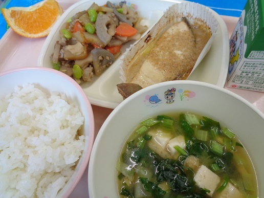 ごはん サケのみそマヨ焼き れんこんの金平 青菜のみそ汁 牛乳 吉田ポンカン