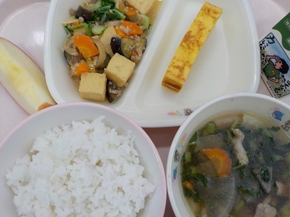 ごはん 卵焼き 生揚げの味噌炒め のっぺい汁 りんご 牛乳