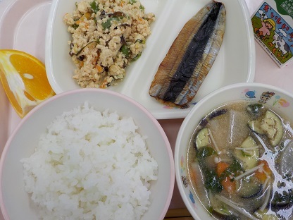 ごはん さんまの一夜干し 炒り豆腐 鶏つみれ汁 三芳の甘夏 牛乳