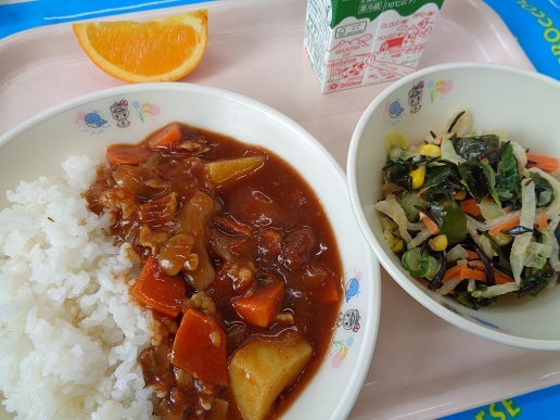 ハヤシライス 海藻サラダ 牛乳 オレンジ