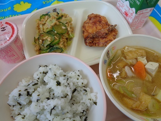 わかめごはん 鶏の唐揚げ 納豆和え 豚汁 牛乳 いちごヨーグルト