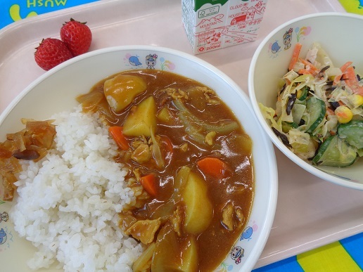 ポークカレーライス ひじきサラダ 福神漬け 牛乳 いちご