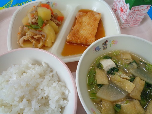 ごはん イカのレモン煮 肉じゃが 青菜のみそ汁 牛乳