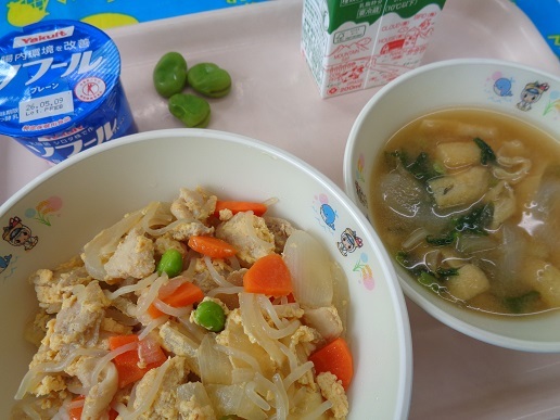 親子丼 ゆで空豆 じゃが玉みそ汁 牛乳 ヨーグルト
