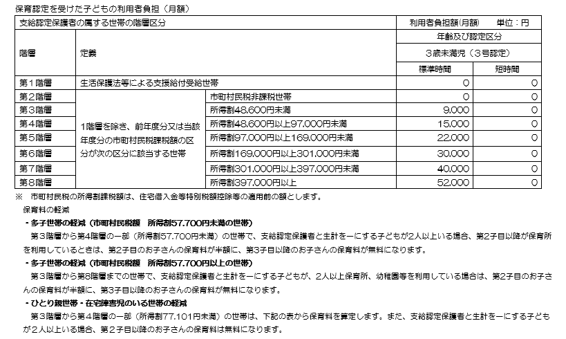 現在、保育に係る時間区分は2区分ありますが、短時間保育(午前8時15分~午後4時15分)については、全階層無料とし、標準時間(午前7時15分~午後6時15分)については、国が定める基準額の半額程度とします。