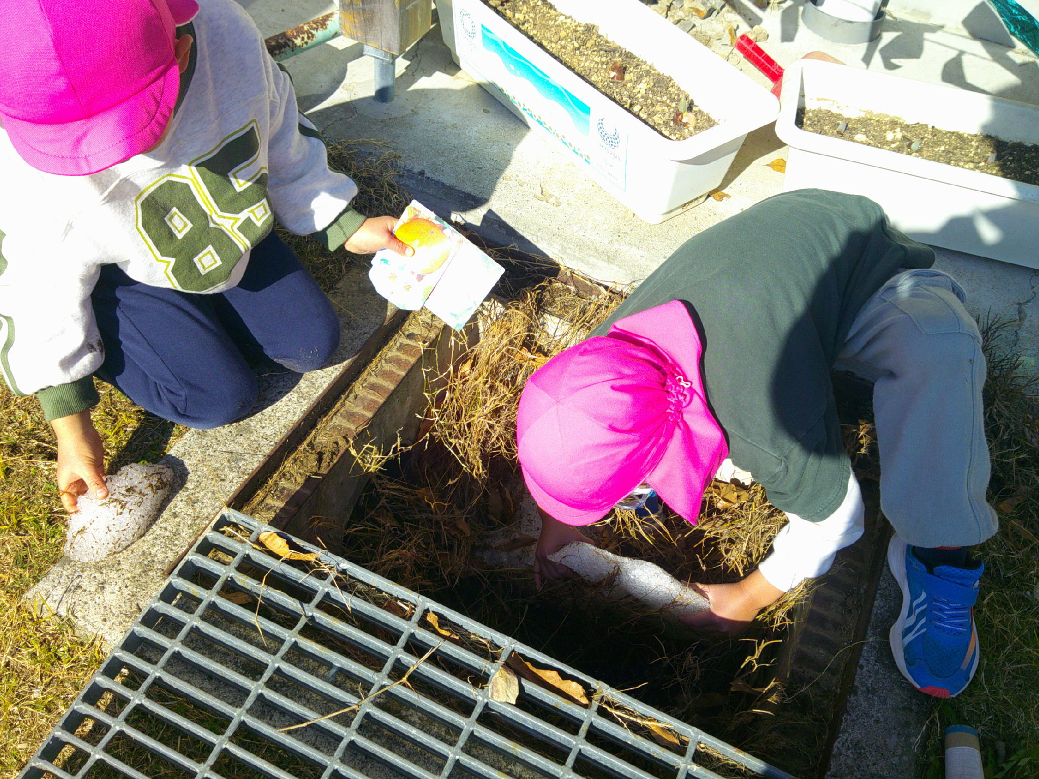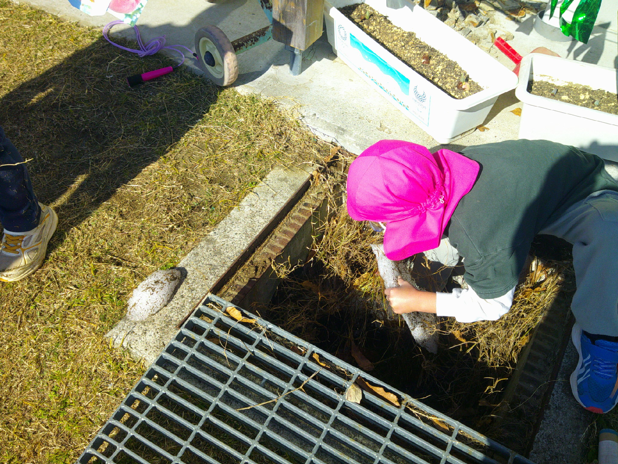 先生に頼んで グレーチングを開けてもらうと