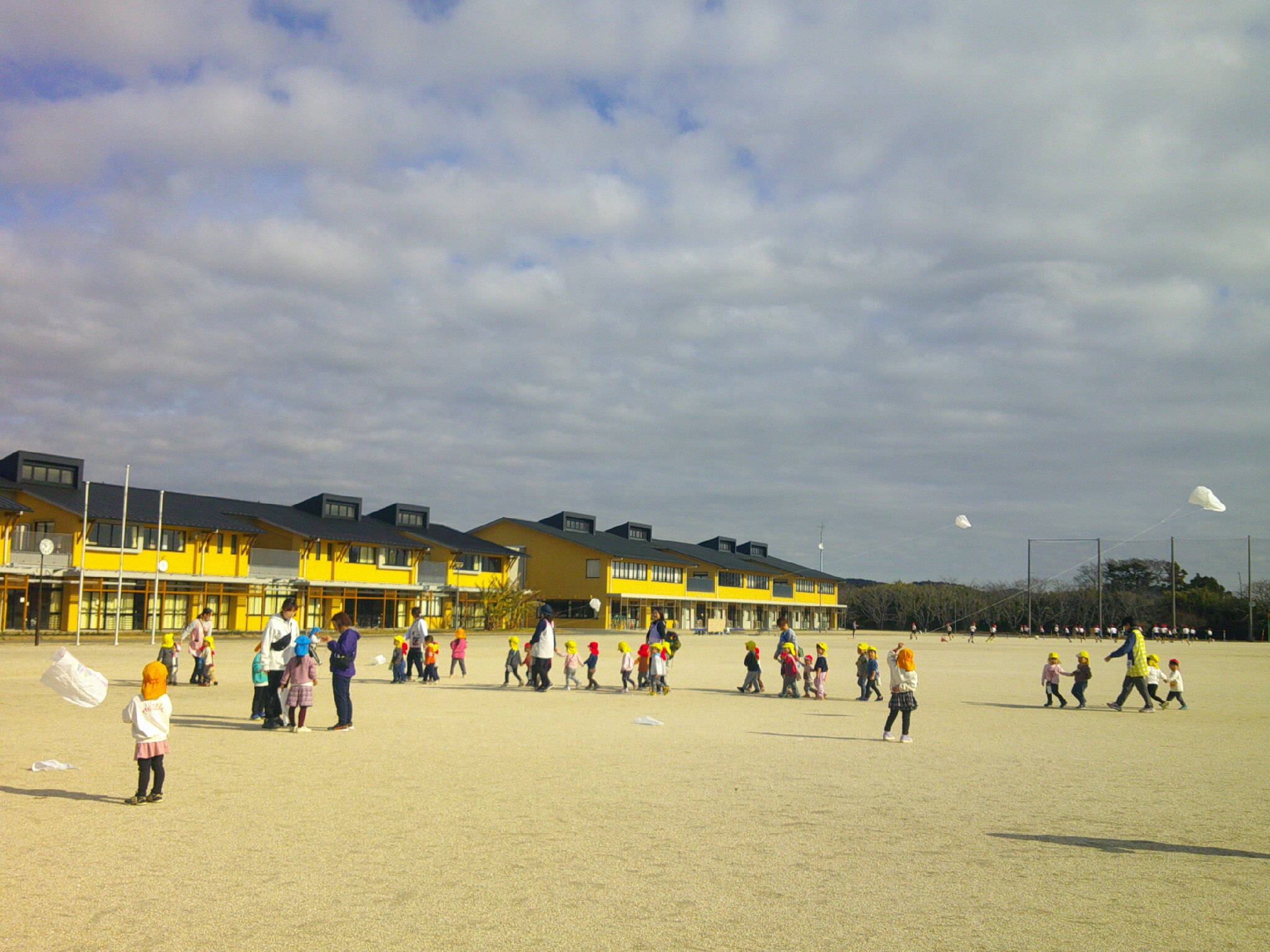 中学校のグラウンドで凧揚げをしている
