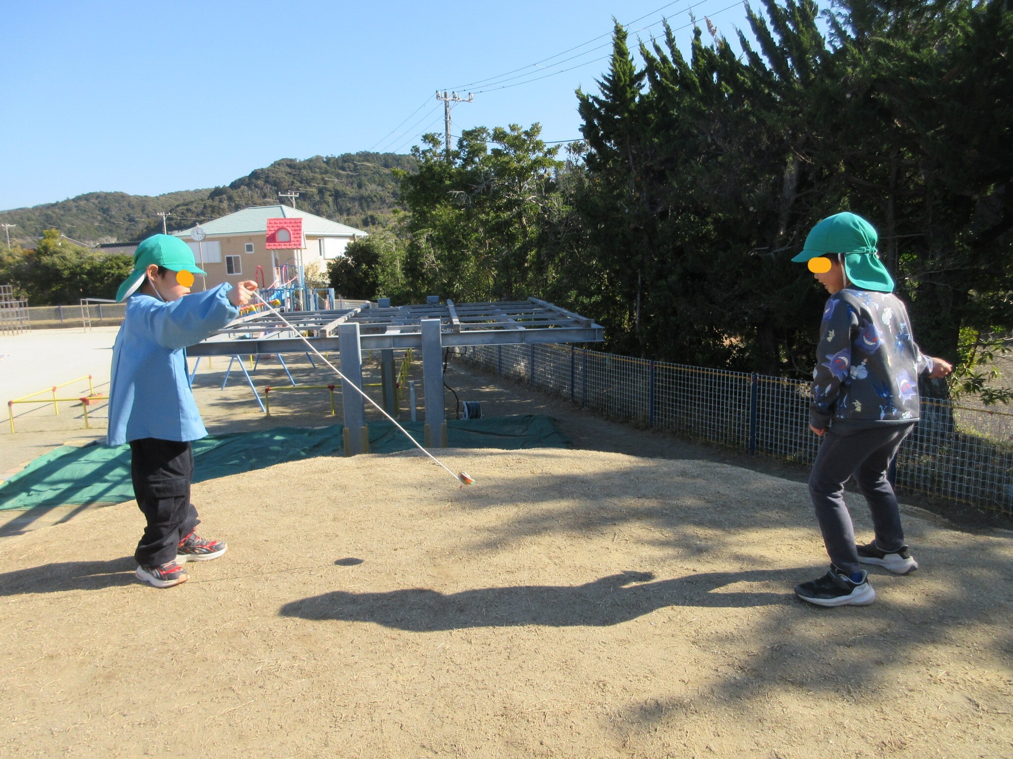 子どもたちは、いろいろな場所でこま回しができるか試しています。