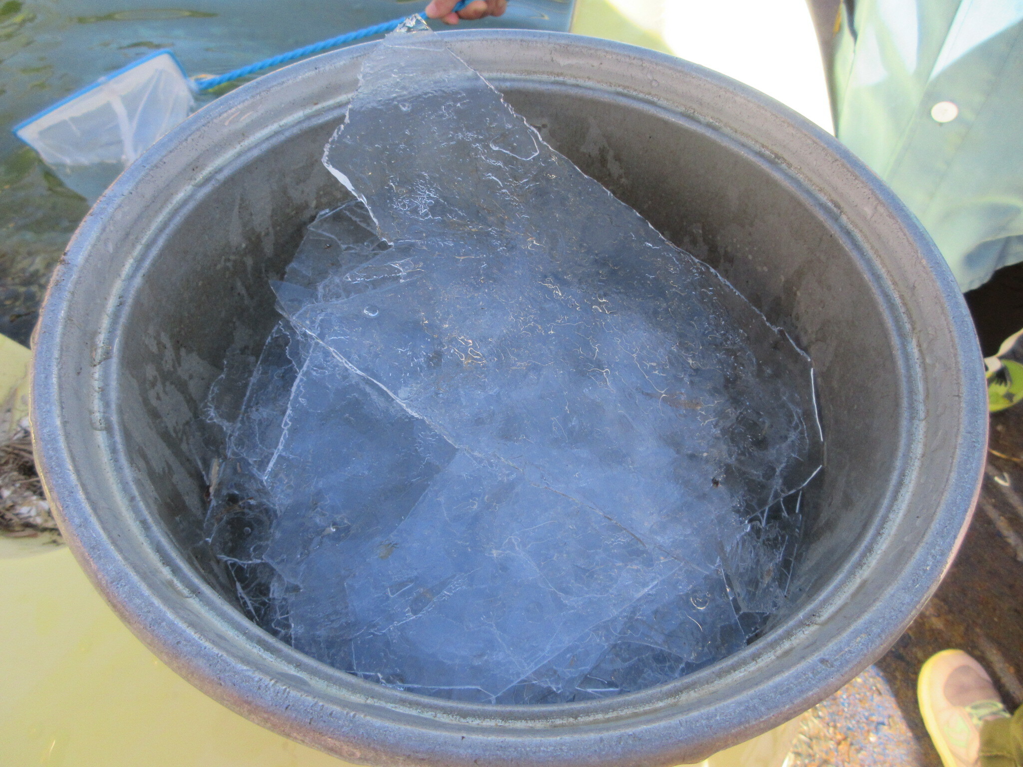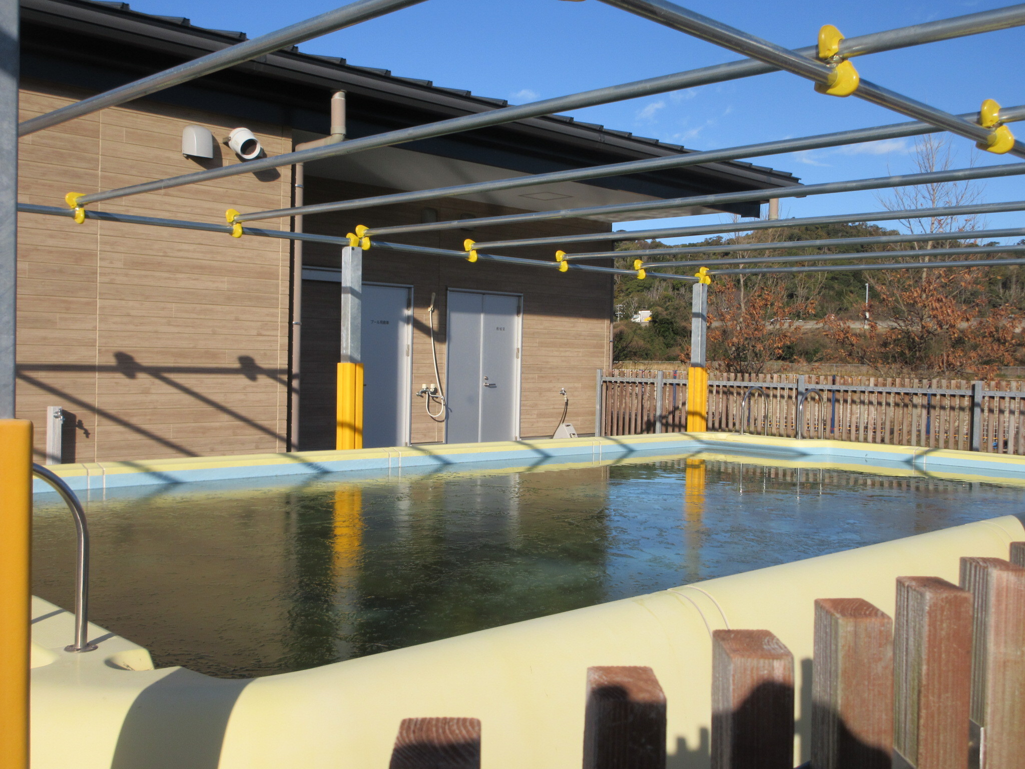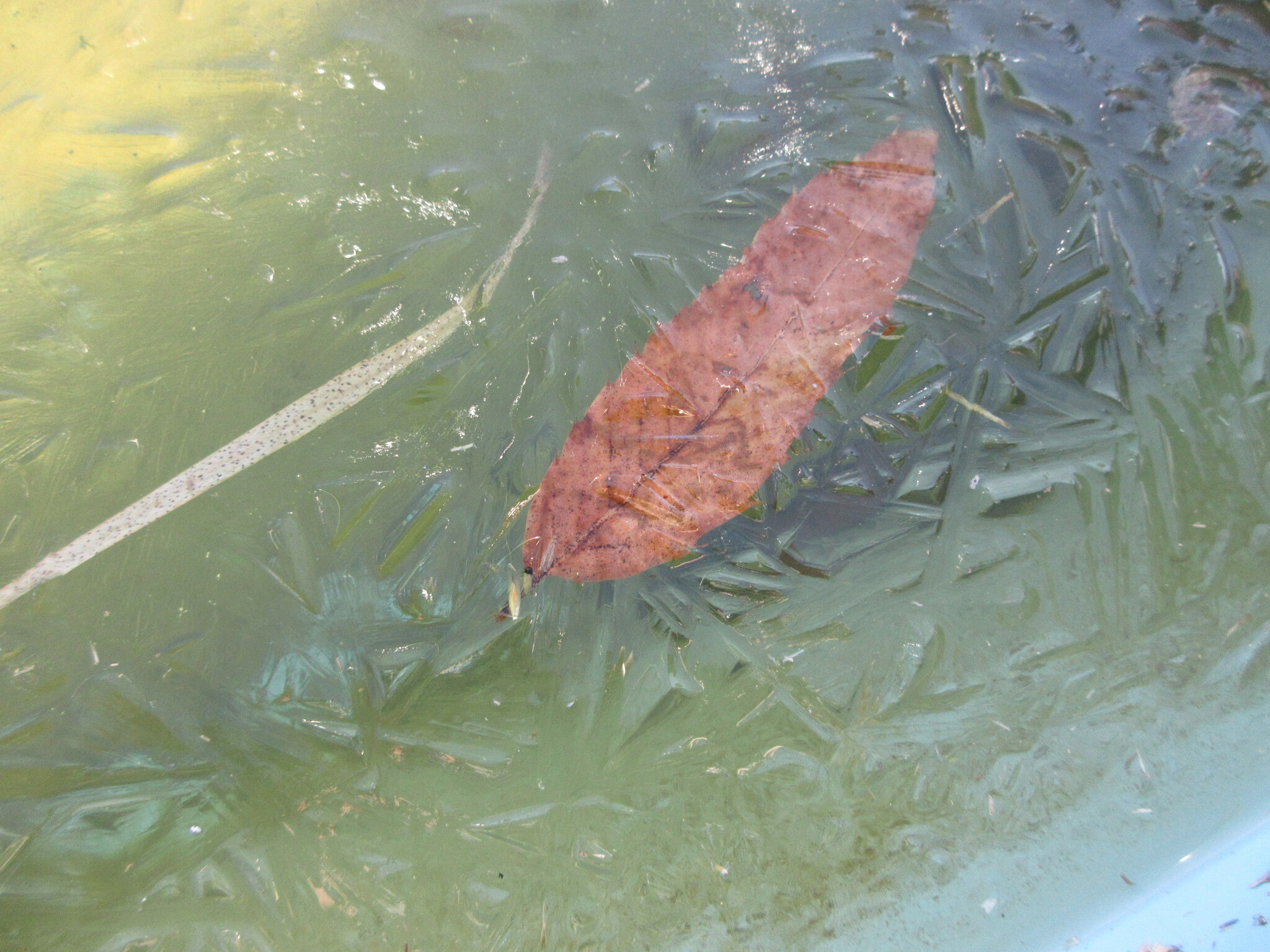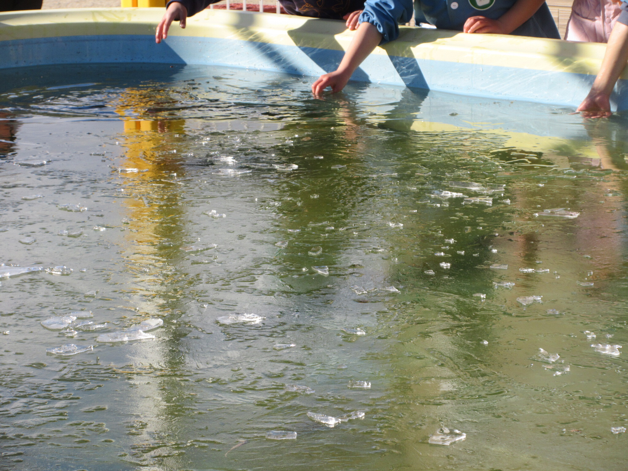 気温が下がり、プールに氷が張りました。