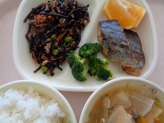 ご飯豚汁さわらの幽庵焼きブロッコリーひじきの煮物いよかん