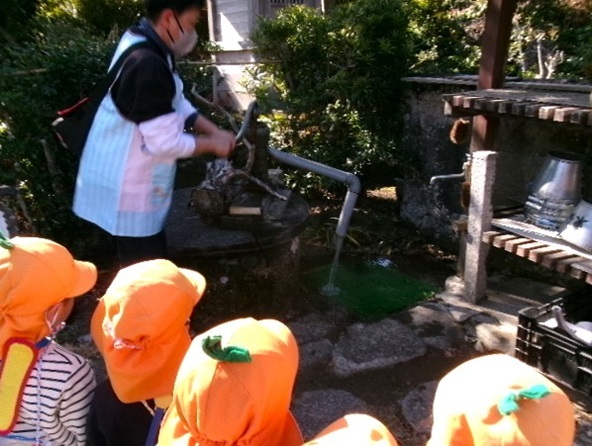 手押しポンプがあり、水があふれでて