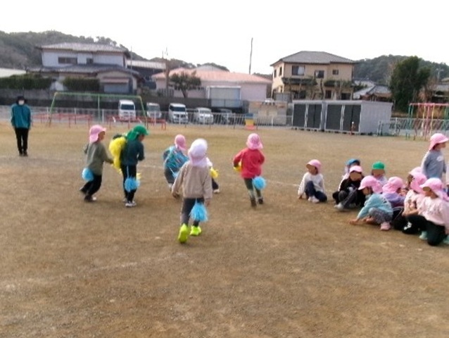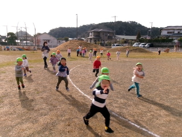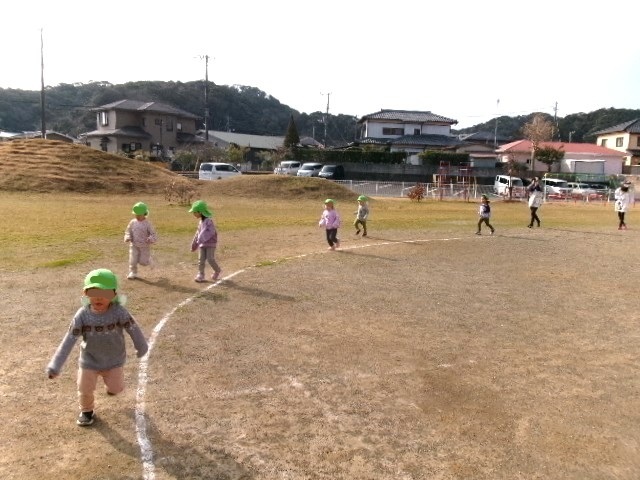 3歳さんが園庭を走っていると、2歳の