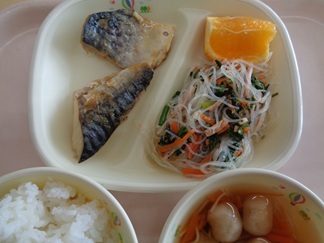 ご飯すまし汁(そうめん、椎茸、麩、人参)鯖の味噌煮ほうれん草サラダいよかん