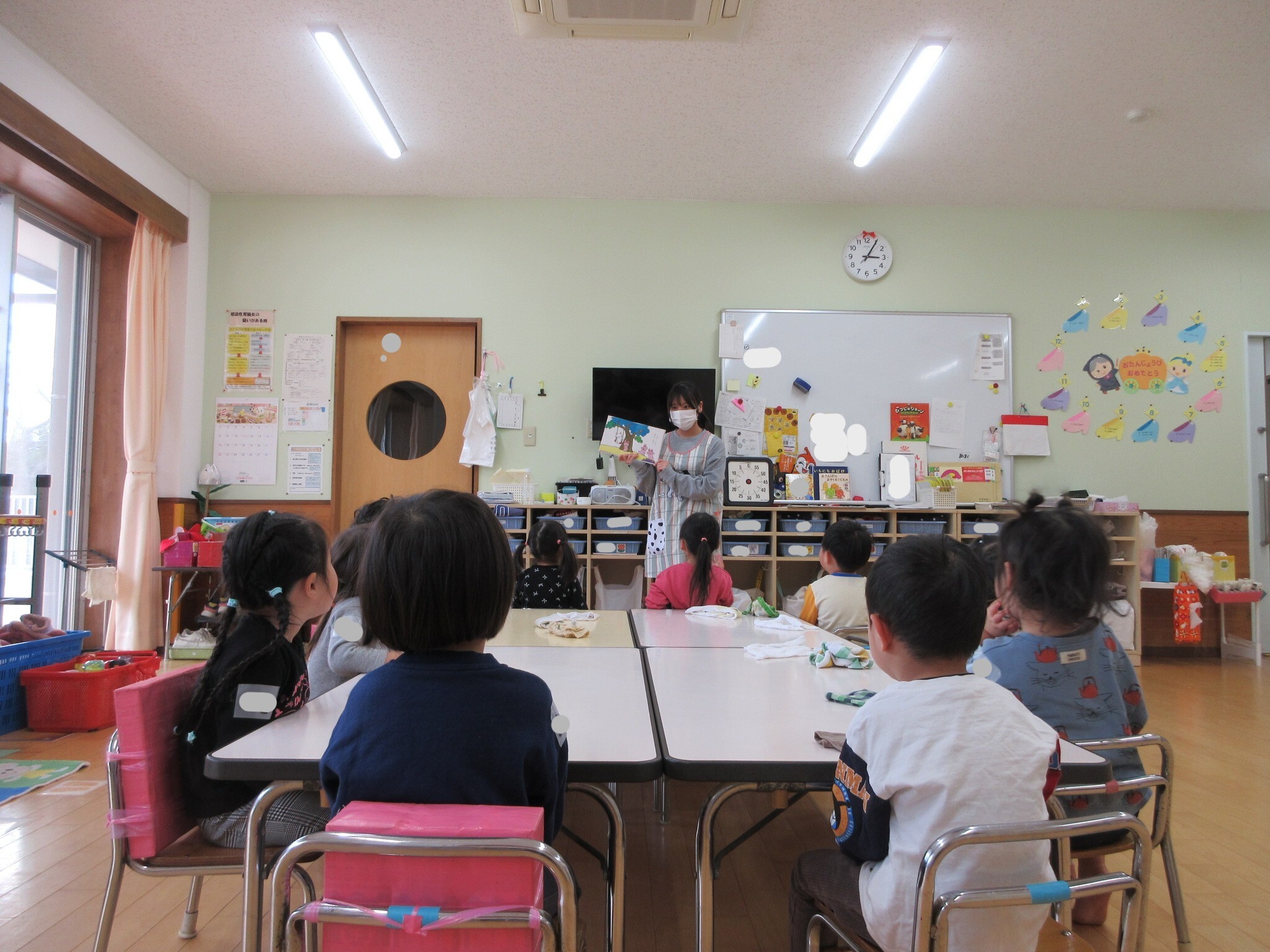 今日のうさぎ組さんは、実習生が読んでくれています。