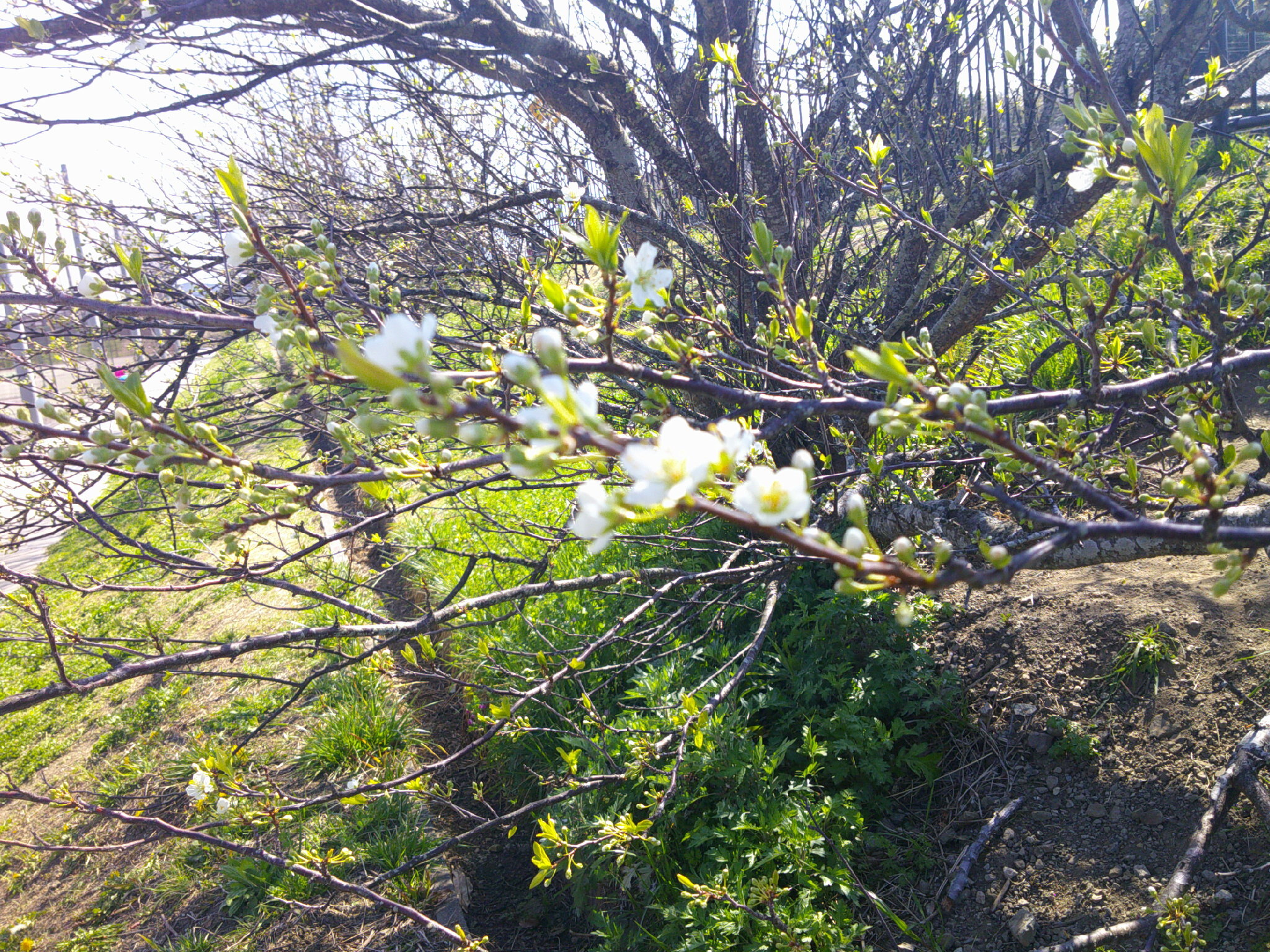 土手には すももがたくさん花をつけました。