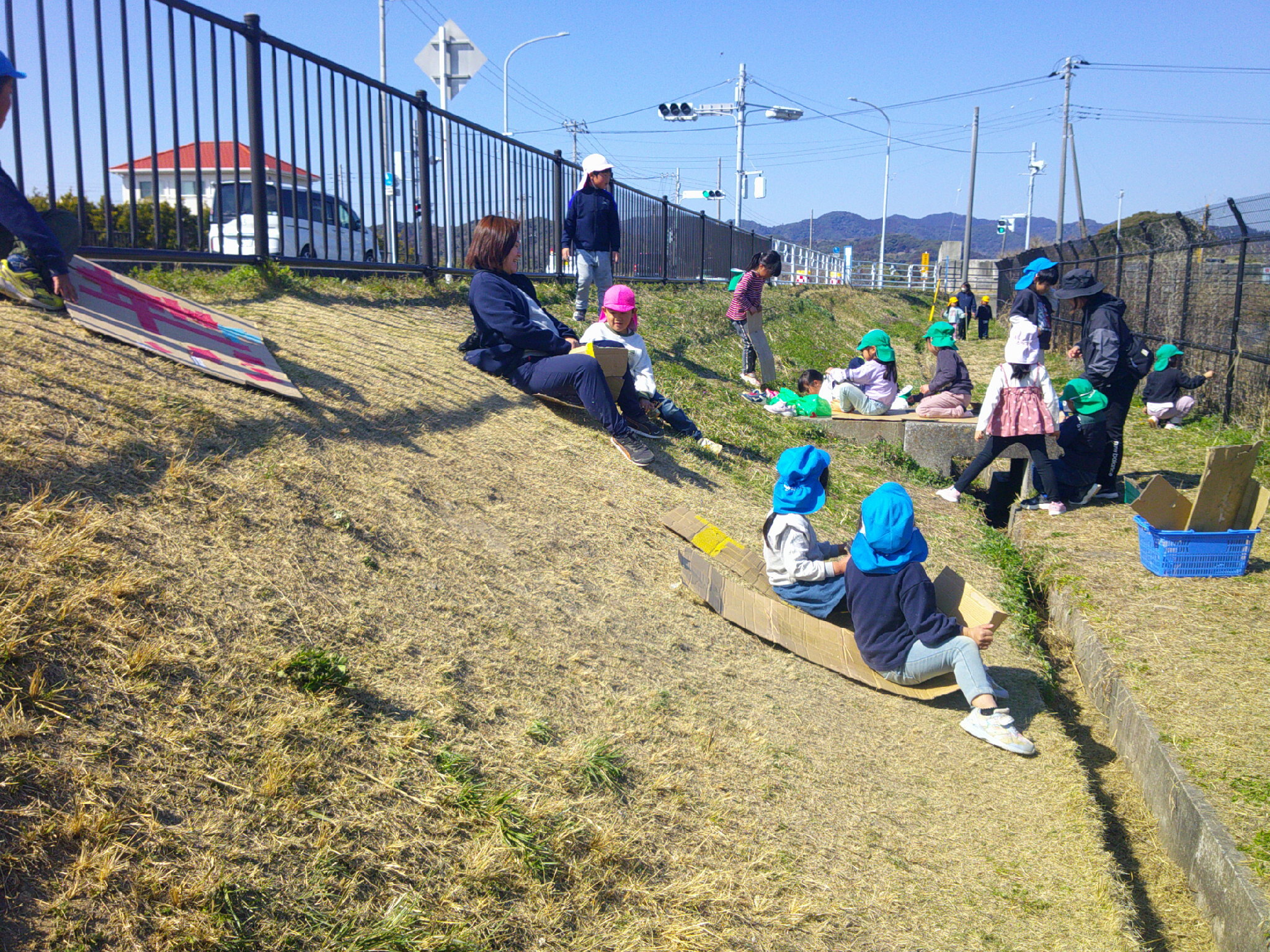 暖かな土手で そり滑り。
