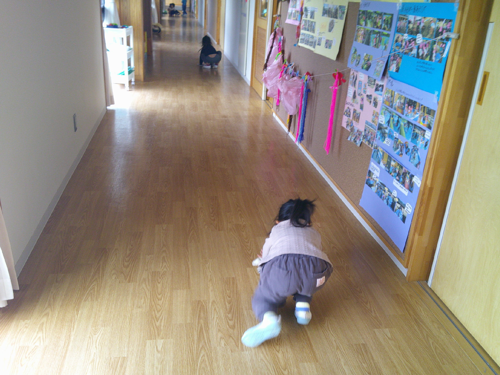 3歳さんが 廊下掃除に挑戦中。