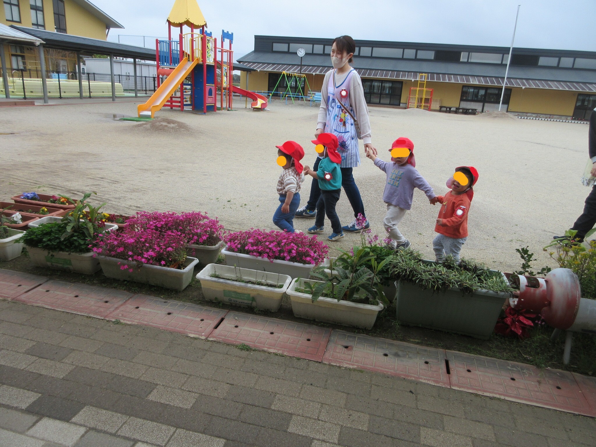 小学校の桜や中学校の色とりどりのお花を見ながら、