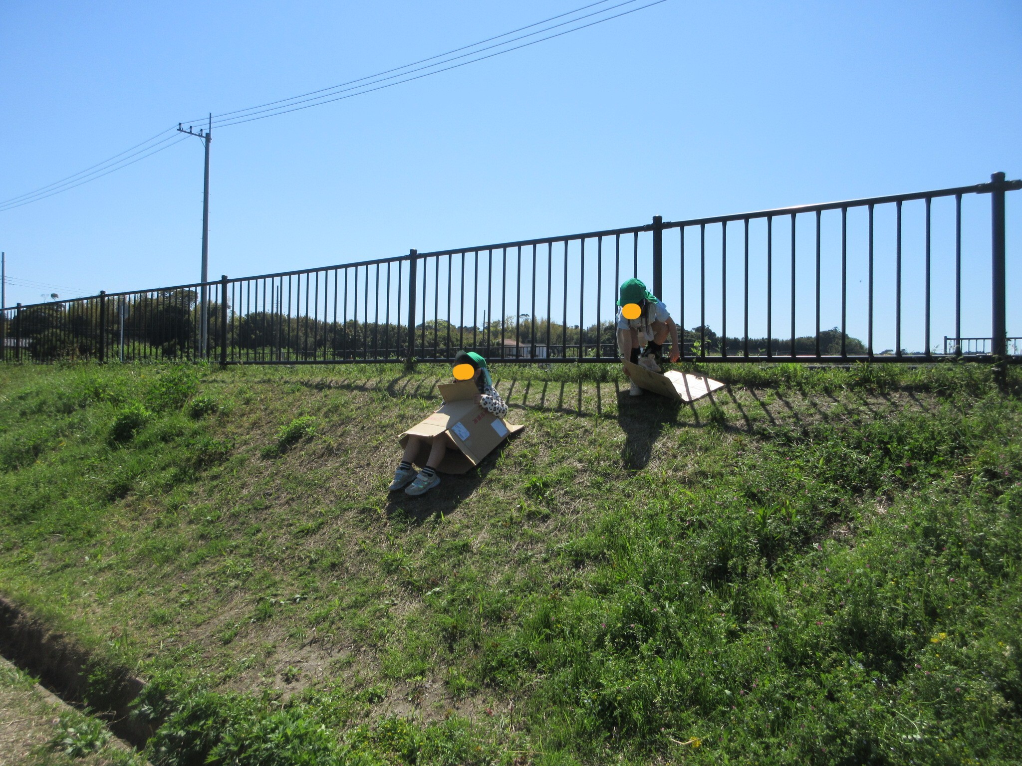 段ボールを手に遊ぶ子どもたち。