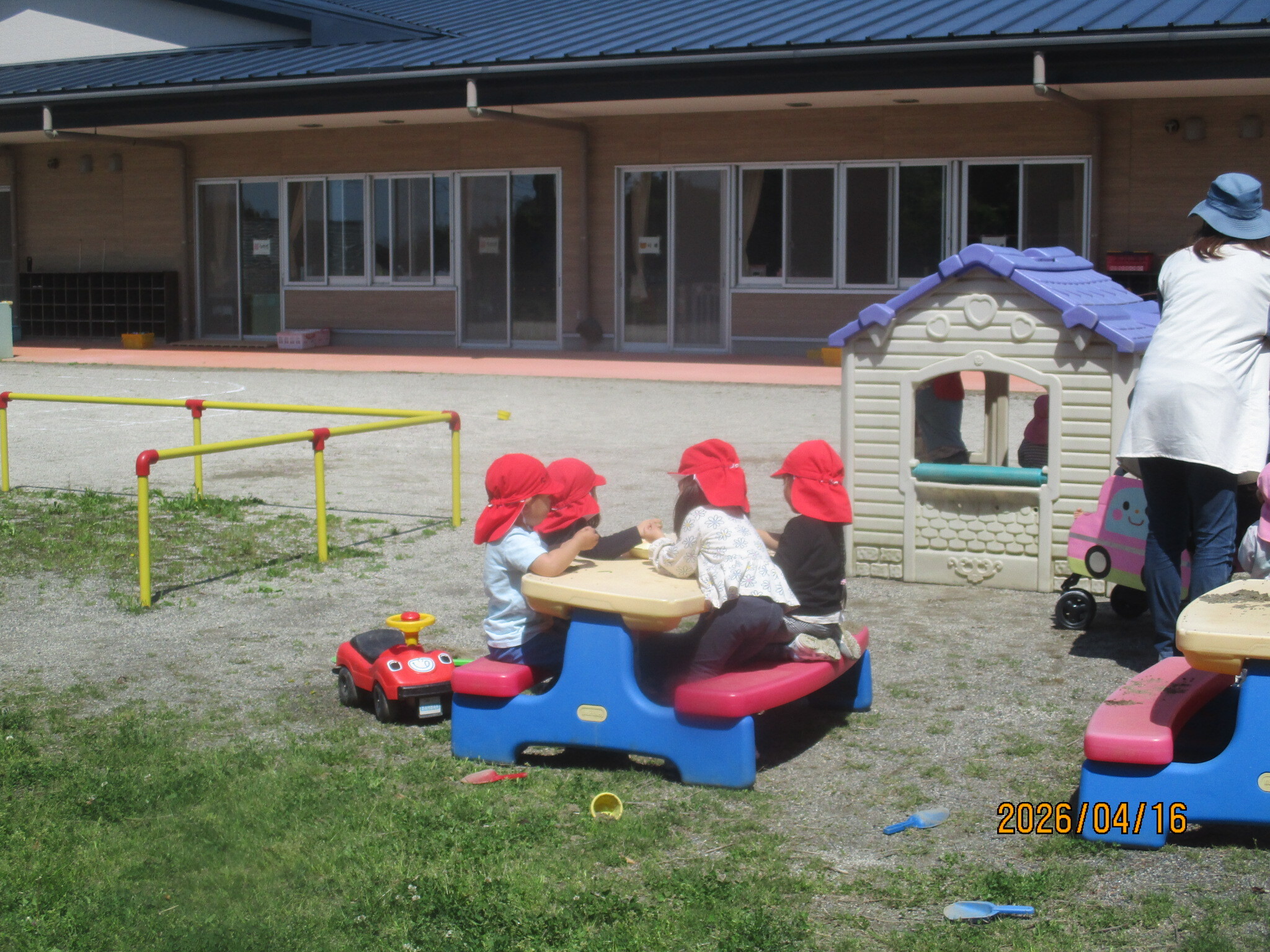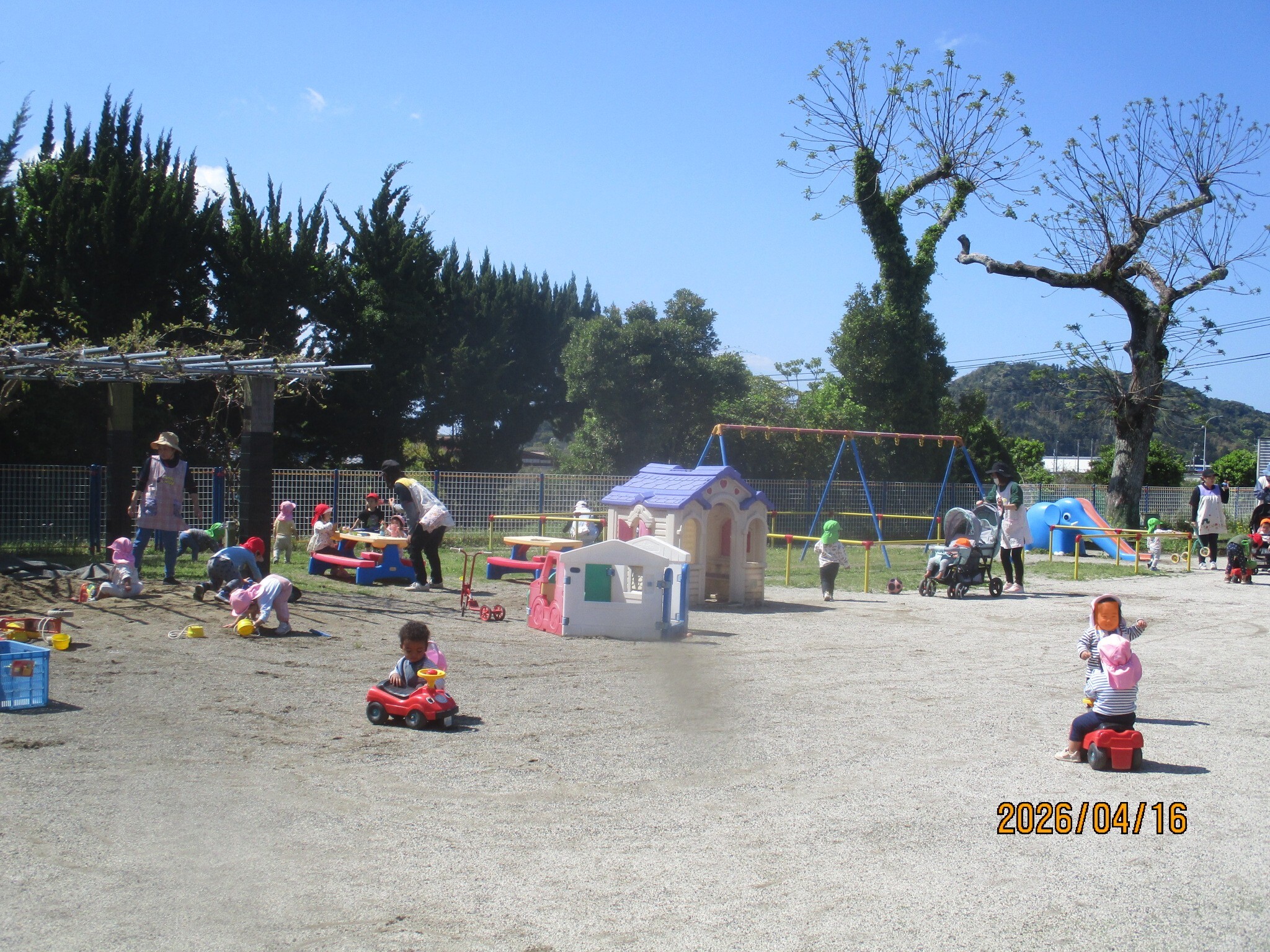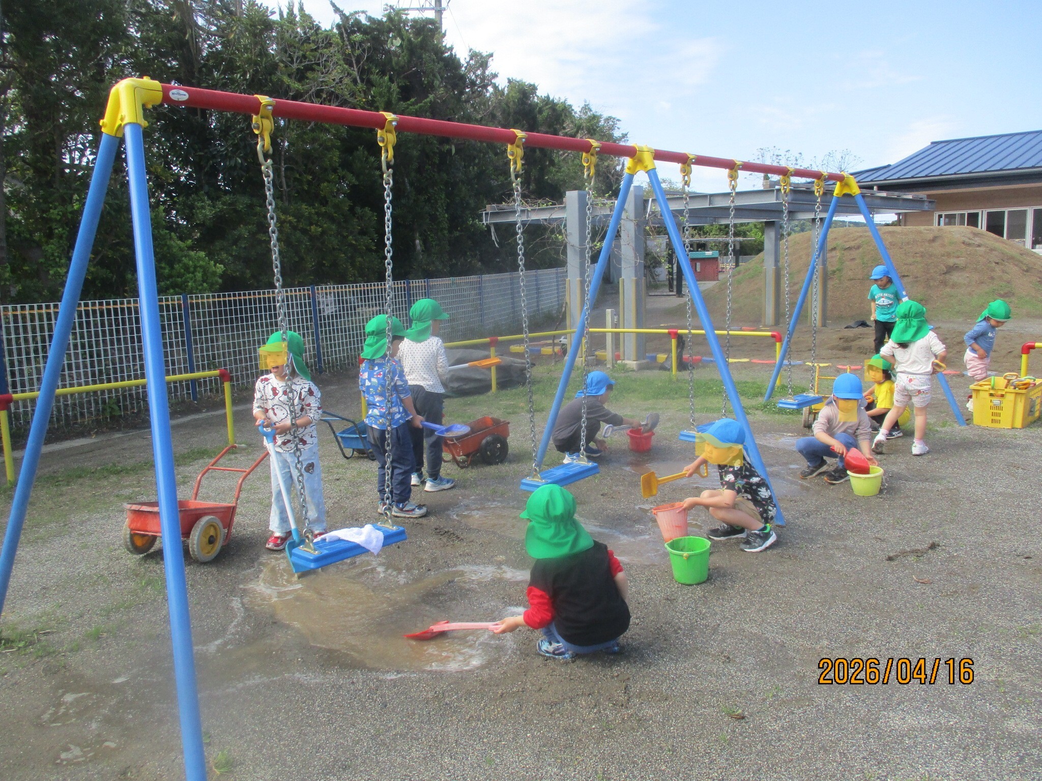 外遊びの前に、雨で濡れた遊具をみんなで拭きます。