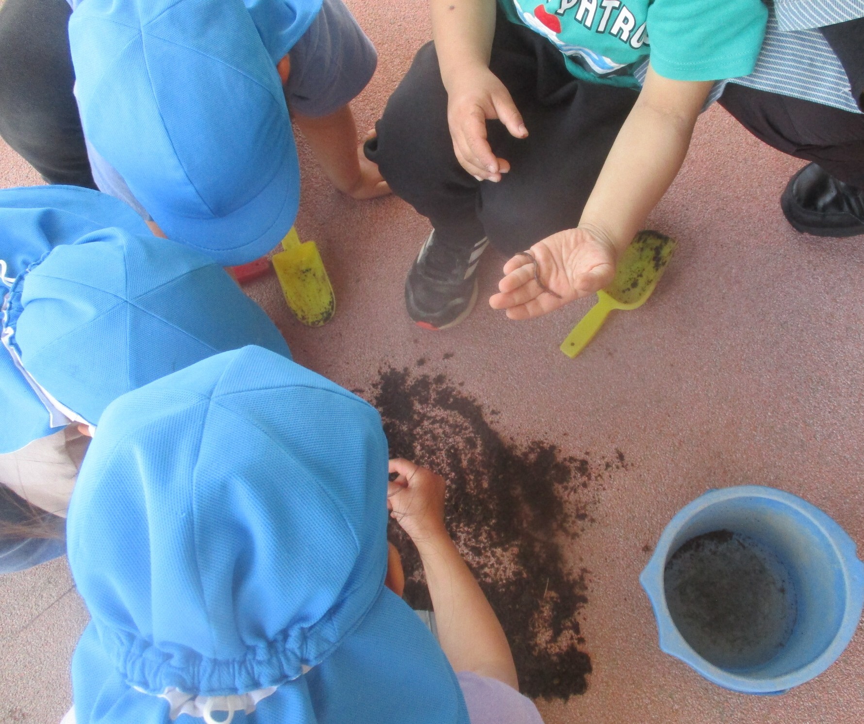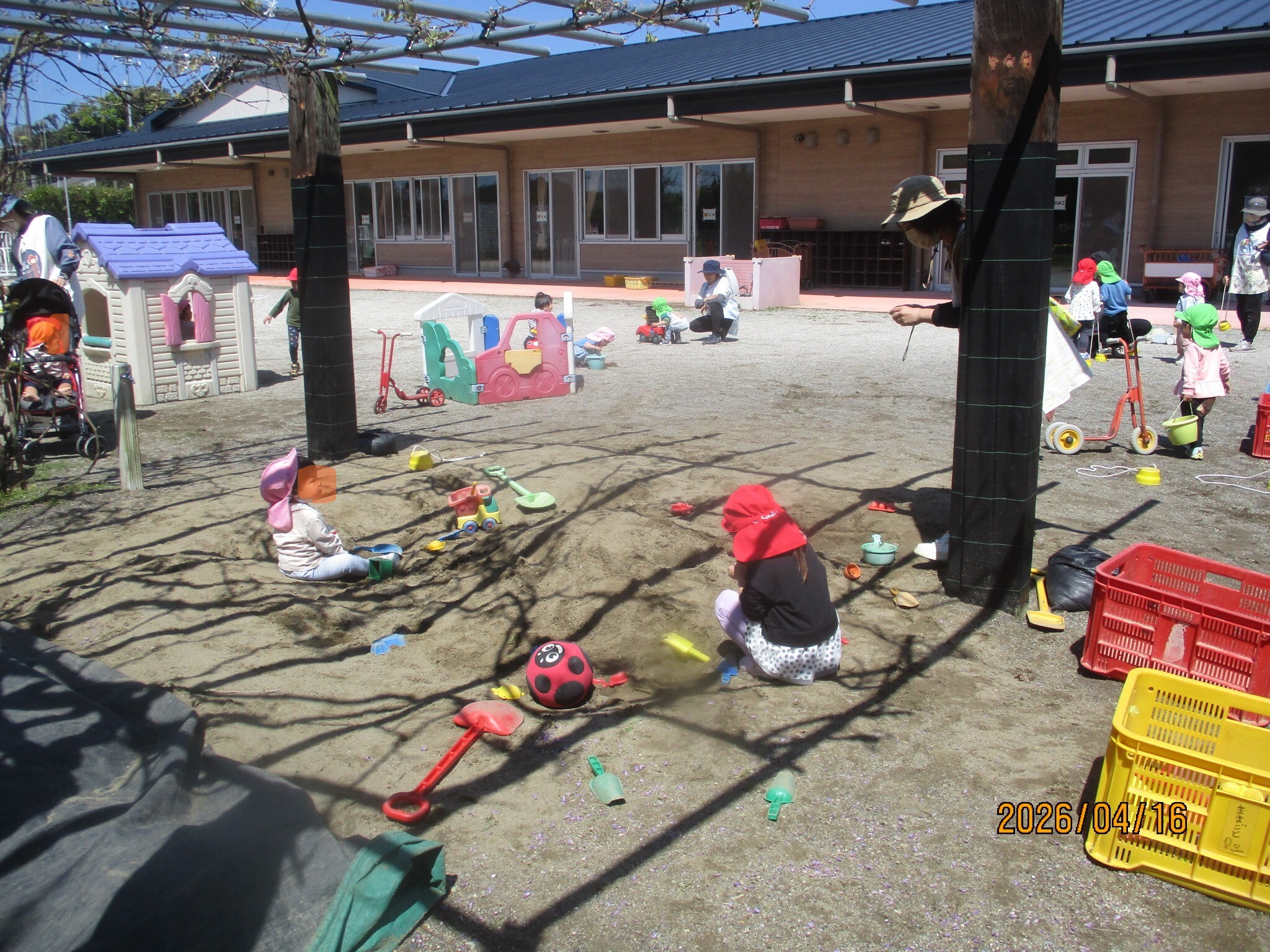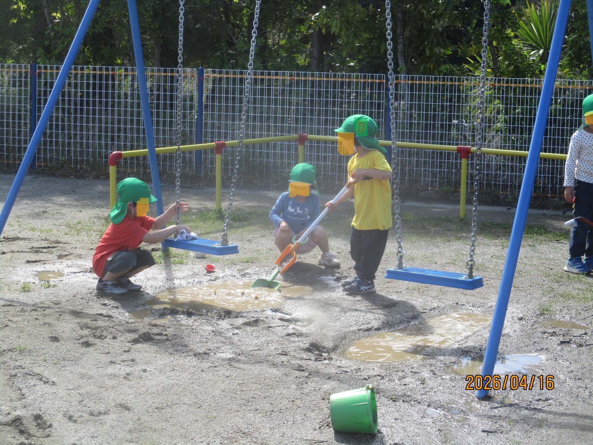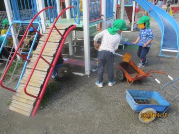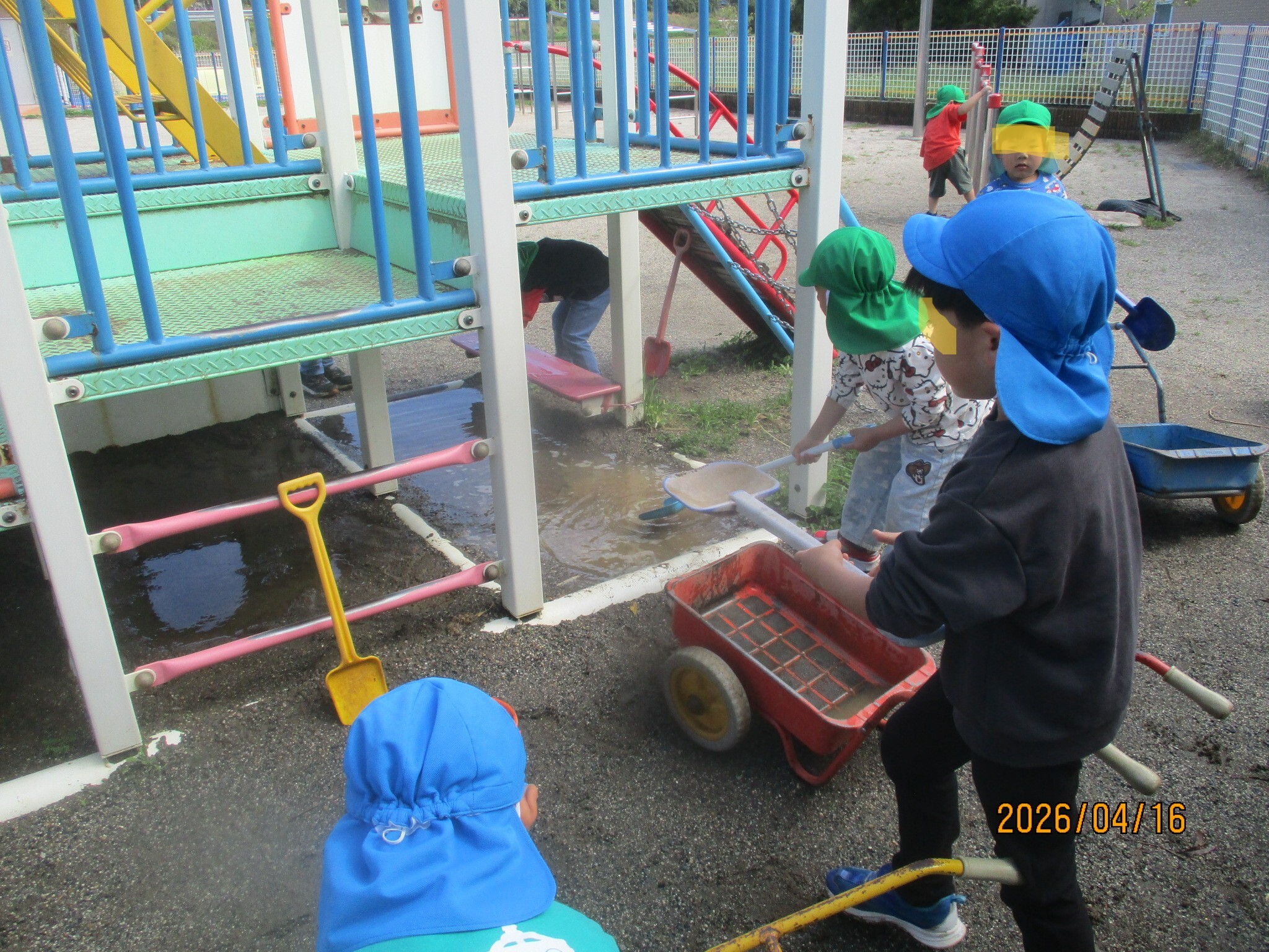 シャベルでかき出し集め運び出したり、砂場の砂を入れたりしました。