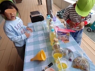 学園の先生からパンジーの花がらをもらいました。さっそく、色水遊びが始まりました。